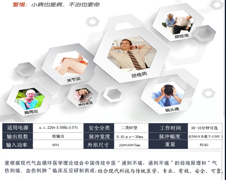 中頻經(jīng)絡通治療儀適應范圍:頸椎病、肩周炎、落枕、腰椎間盤突出癥、軟組織挫傷的輔助治療等。
