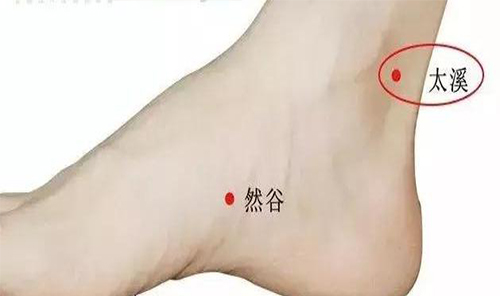 在足內(nèi)側(cè),內(nèi)踝后方,當(dāng)內(nèi)踝尖與跟腱之間的的凹陷處。